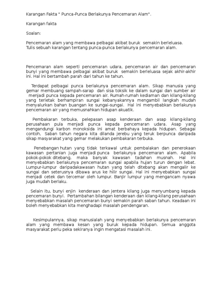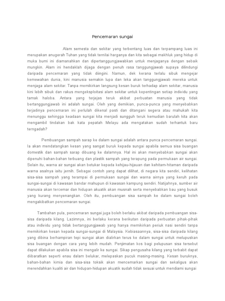 Contoh Karangan Punca-Punca Pencemaran Sungai Yang Memberi Kesan Kepada Alam Sekitar Pendahuluan. Huraikan kepentingan sungai kepada manusia. Thanks for the amazing karangan.